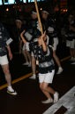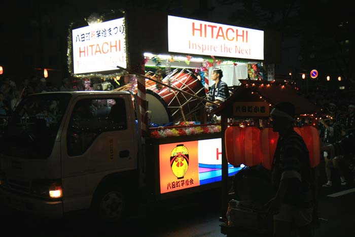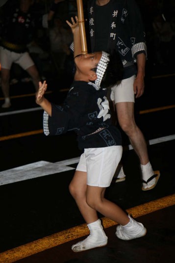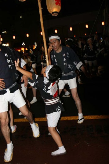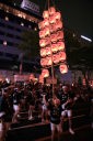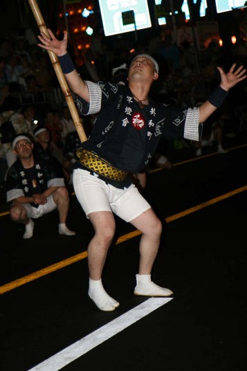 竿燈はチームの技の出し合いで、大人の竿燈は高さ約12m46個の提灯に火が入りバランスを保ちながら次々と持ち手が変わって技を競い合っていました。台風の余波で風か強かったのと、時折小雨も混じりで悪条件ながらすばらしかったです。