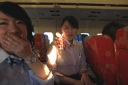 移りゆく雲の様子を眺めながらのフライト、あっという間に1時間あまりが過ぎました。客室乗務員とも楽しくお話が出来、記念写真もパチリ