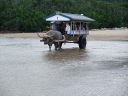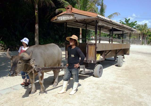 | 西表島から由布島へ続く浅瀬を渡す水牛西表島と由布島を結ぶ名物の水牛車。満潮でも水深1m程の浅瀬をマングローブを見ながらゆっくりと進んでいく。由布島は、周囲約2.2kmの自然豊かな小さな島。ヤシの木など亜熱帯樹木におおわれ、色鮮やかな花々が咲いている。島全体が亜熱帯植物楽園として整備されている |
