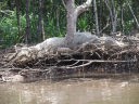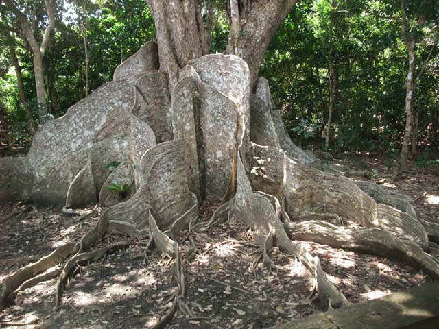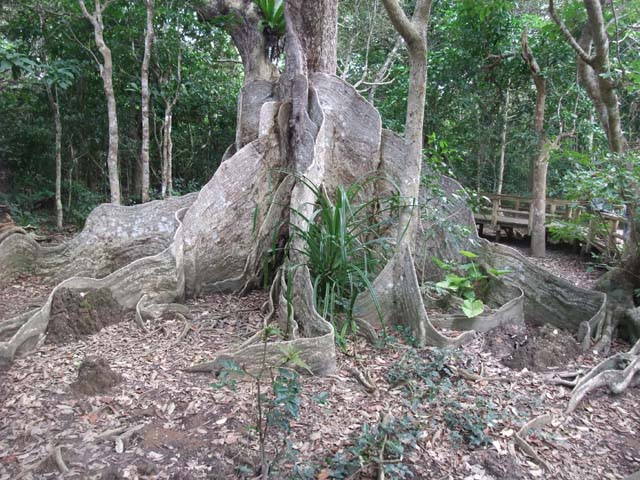 | 仲間川中流域、国内最大級のサキシマスオウ仲間川を約5km遡ると観光船の終点、ここからわずかに山中に入った所にある。樹高約20m、樹齢約400年で国内最大といわれる。大きく板状に張り出したものは「板根」と呼ばれる木の根っこで、この木の板根は高いところでは人の背丈の倍以上の3.9mもある。 |
