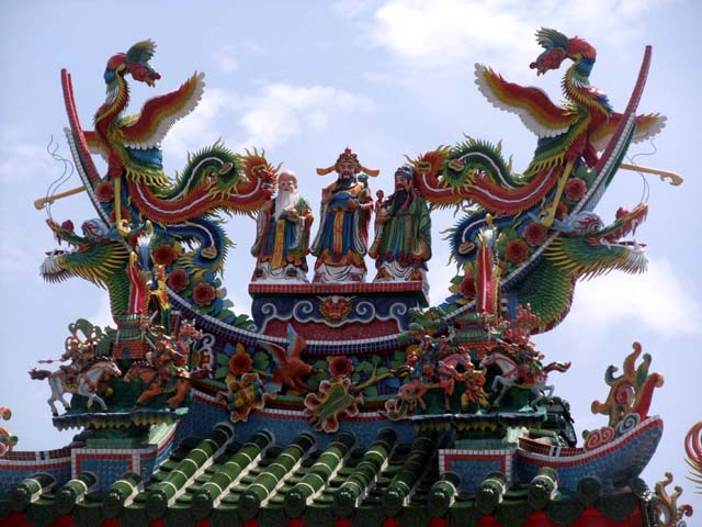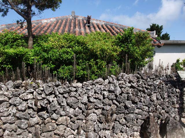 | 周囲6kmの隆起サンゴ礁の島中央に、サンゴの石垣で囲まれ、魔除けのシーザー、白いしっくいで固められた赤瓦葺などの特徴がある民家があちらこちらに見られる。フクギの防風林や碁盤の目のように走る白砂の道など、家の周囲にも特徴が。国の重要伝統的建造物群保存地区。赤瓦の屋根、珊瑚石灰岩の石垣、白い砂の道。美しい竹富島の集落を、のんびり水牛車に揺られ、案内人が披露してくれる三線弾きや民謡で島時間が始まった。 |