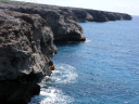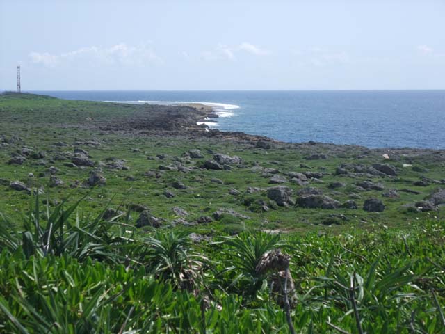 | 高那崎日本最南端の碑から東側へ約1kmに渡って続く高さ10数mの断崖海岸。琉球石灰岩が侵食されて形成されたもので、ここからは太平洋の雄大な景観が広がる。少し突き出た所が高那崎。岩礁に荒波が打ち砕ける豪快な風景を見下ろせる。海は透明度が非常に高く、目の覚めるようなマリンブルーの色彩に感動する |