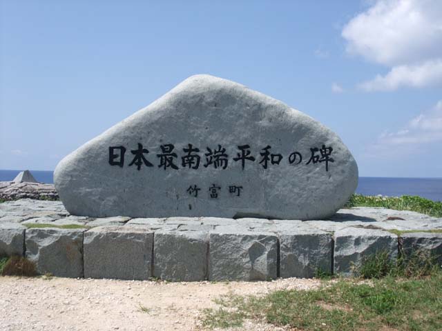 | 日本最南端波照間島は人が住む「日本最南端の島」碑は島南部の高那海岸の景勝地に立つ。ここからは視界270度にわたる太平洋を望める。1972(昭和47)年の日本復帰を記念して建立された。周囲にはハマユウの白い花も。 |