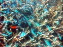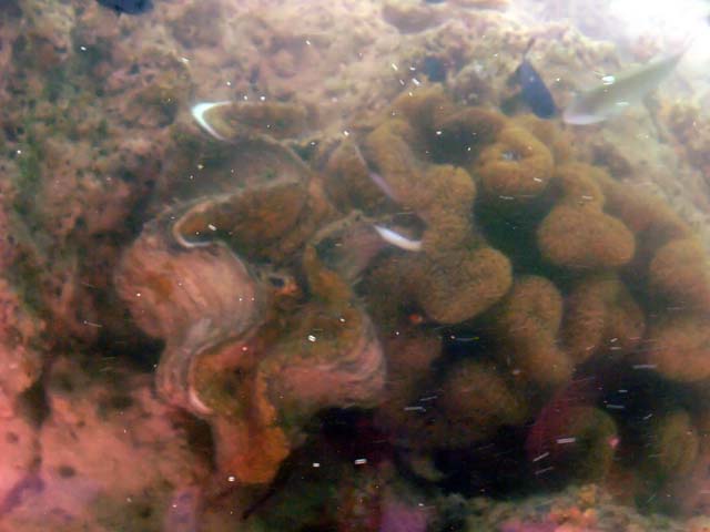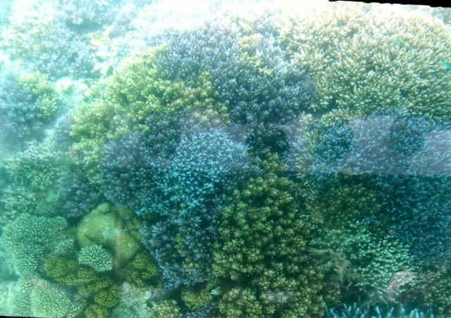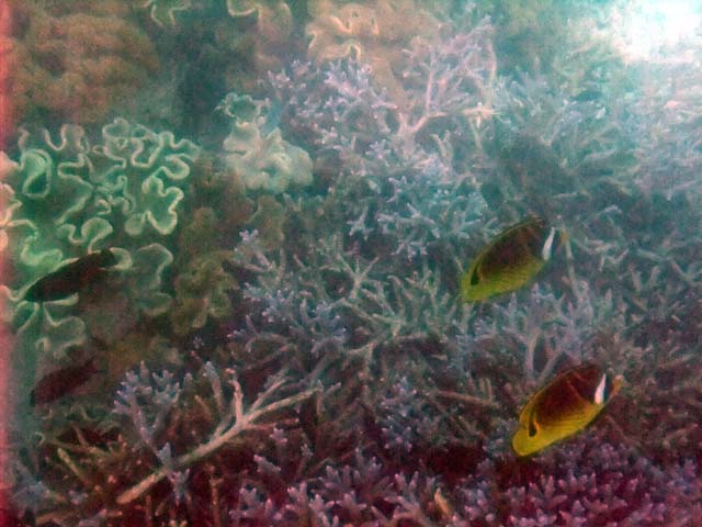 | 澄みきった海中には無数の珊瑚や魚、なまこまで鮮やかに見えました。珊瑚の間に熱帯魚も |