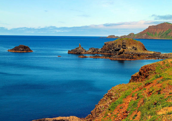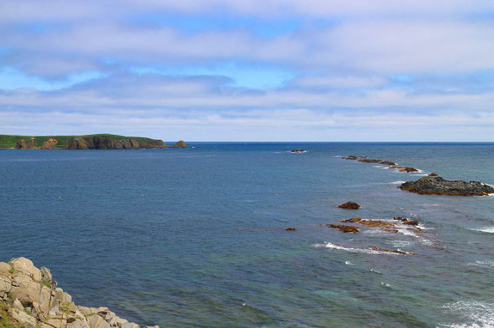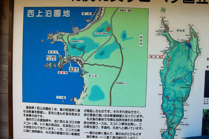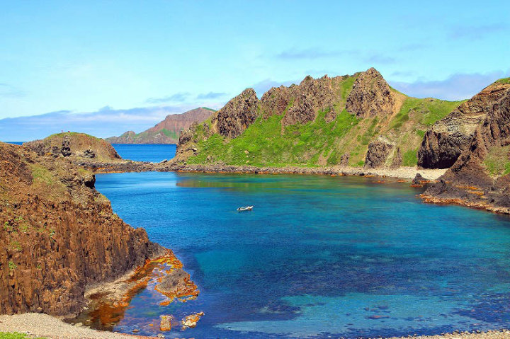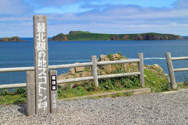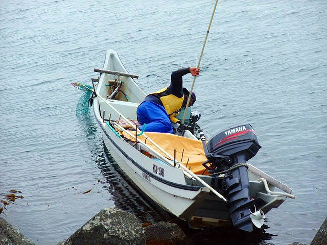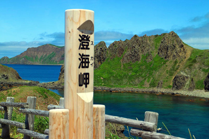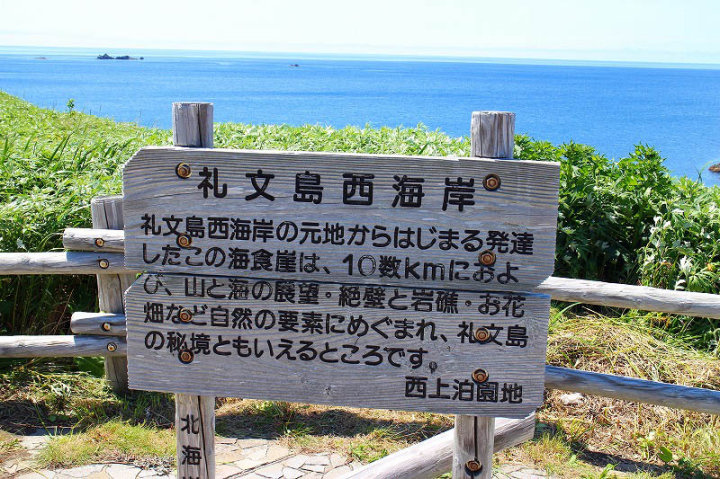 日本北限の地・スコトン岬・スカイ岬では入り江でウニ漁の小船が・・・・海の青さがすばらしい景色でした。