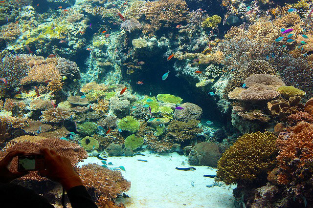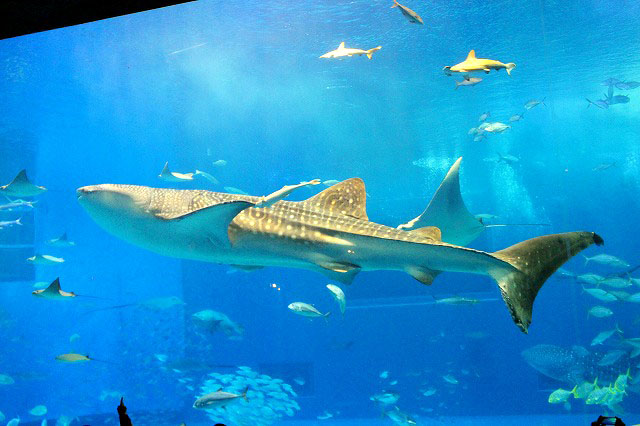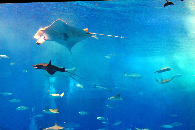 ジンベイサメやマンタがゆうゆうと泳いでいました。
