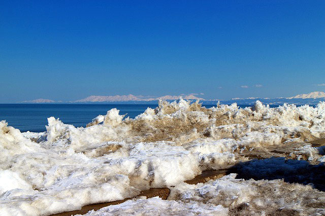 ホテルから見える海岸には流氷の残骸が、沖には流氷の帯が見えました。途中斜里岳もくっきりと