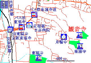 ![]() JR奈良線「東福寺」駅又は京阪本線「東福寺」駅下車。改札口を出て駅南側にある高架道路に沿って東の方向に進み、京都第一日赤病院の前を通り、泉涌寺道交差点で右折し、東の方向へ道なりに「今熊野観音寺」への道筋を示す標識に従って進む。「東福寺」駅から徒歩約25分。 JR「京都」駅前から京都市バス([208]系統「東福寺・九条車庫」行き)に乗車し「泉涌寺道」バス停で下車すると、JRや京阪電車を利用する場合よりも歩く距離は短くなるが、バスの運行頻度、乗車時間などからみて、JR又は京阪電車を利用する方がよい。 |