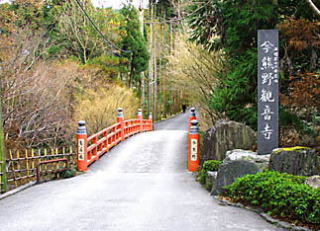 参道を進むと朱塗りの「鳥居橋」と『今熊野観音寺』と刻まれた石柱があり、ここから奥が観音寺の境内になっているように思われるが、通常の寺院に見られるような山門がない。 |